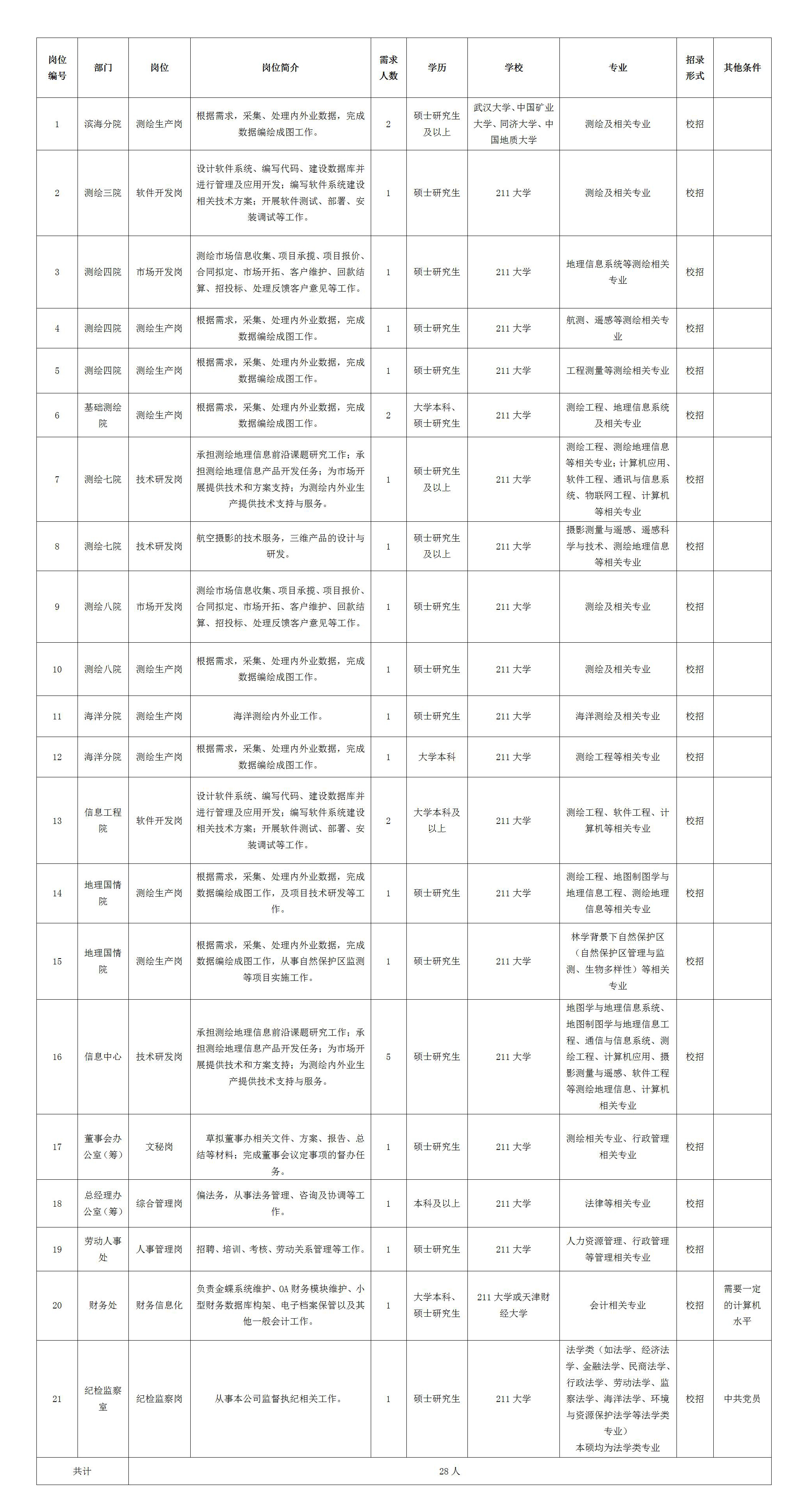根據(jù)工作需要,天津市測繪院有限公司擬公開招聘應屆高校畢業(yè)生28名,具體事項如下: