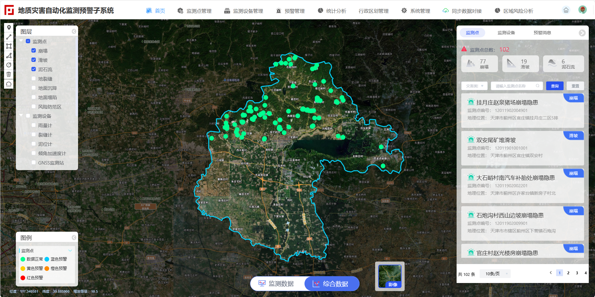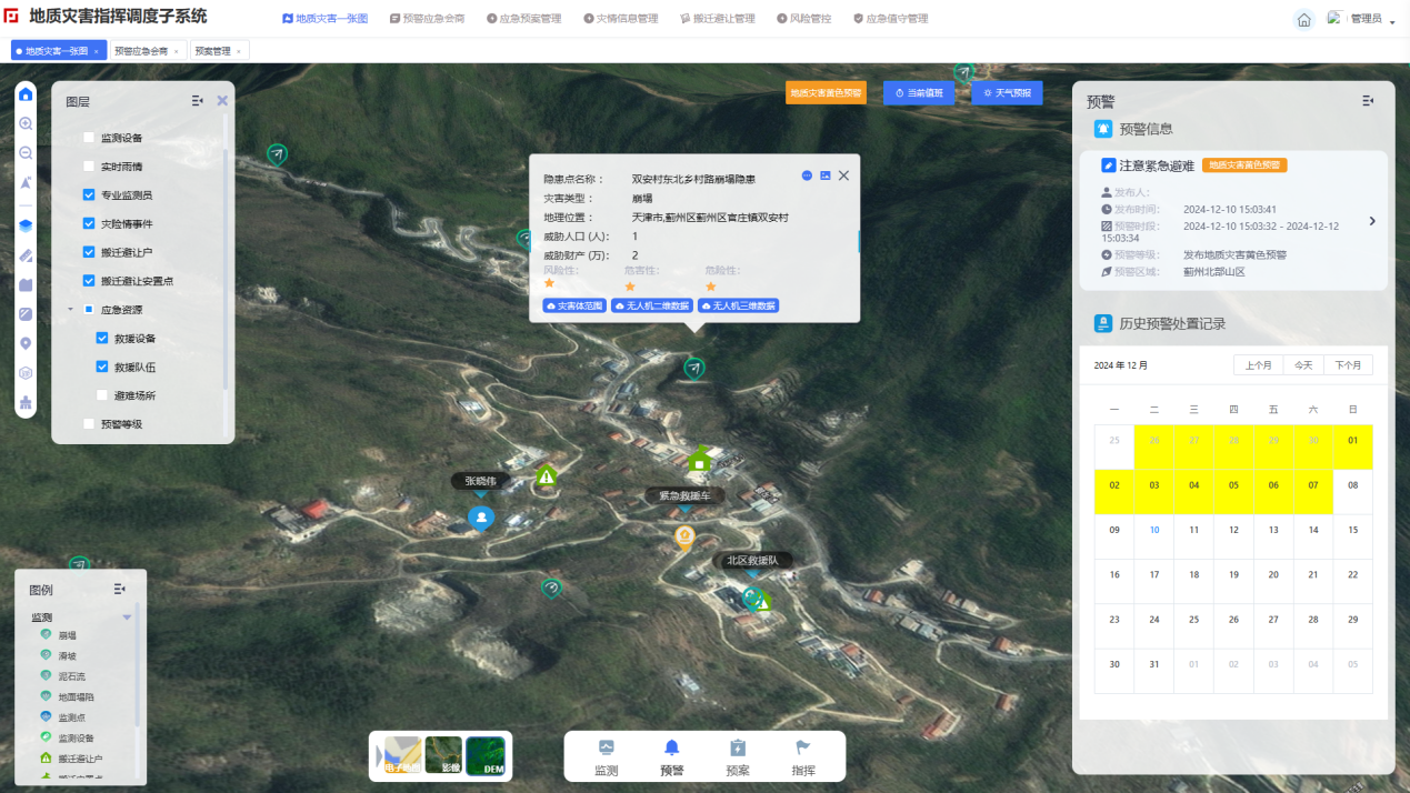 二、建設內容 1 建設思路 圖1 建設思路 本次天津市地質災害風險預警系統(tǒng)建設項目以天津市北部山區(qū)突發(fā)性地質災害風險預警為主體,涵蓋從北部山區(qū)到平原區(qū)再到海岸帶的全部天津市范圍。項目總體建設思路如圖1所示,通過地質災害風險預警數(shù)據(jù)資源體系建設,集成預警模型和軟硬件環(huán)境,基于微服務架構實現(xiàn)系統(tǒng)一體化、數(shù)據(jù)集成化、成果可視化,實現(xiàn)基礎地質環(huán)境信息管理、地質災害自動化監(jiān)測預警、地質災害氣象風險預警、預警產品制作、預警成果發(fā)布、預警模型管理、預警指揮調度等基本預警業(yè)務功能,實現(xiàn)國家、市、區(qū)地質災害預警業(yè)務各層級節(jié)點互聯(lián)互通。項目建成后主要服務于自然資源部、天津市政府、天津市規(guī)劃和自然資源局及各分局、地質災害防治管理部門。 2 主要內容 圖2 系統(tǒng)架構 本項目建設內容如圖2所示,主要包括地質災害數(shù)據(jù)底座和數(shù)據(jù)中臺建設、地質災害預警和分析模型建設、地質災害風險預警應用系統(tǒng)建設、地質災害預警預報保障體系建設和區(qū)域地質災害氣象風險預警監(jiān)測網絡站點建設等。具體內容如下: (1)建設涵蓋地理數(shù)據(jù)、遙感數(shù)據(jù)、地質災害自動化監(jiān)測數(shù)據(jù)、地質災害相關地質環(huán)境數(shù)據(jù)、氣象數(shù)據(jù)、鉆孔數(shù)據(jù)等內容的天津市地質災害風險預警數(shù)據(jù)資源體系,形成一套完整的集數(shù)據(jù)匯集、存儲、查詢、展示、分析應用于一體的數(shù)據(jù)中臺管理系統(tǒng)。 (2)建設天津市北部山區(qū)自動化監(jiān)測預警模型、區(qū)域地質災害氣象風險預警模型,實現(xiàn)地質災害隱患點的基礎模型配置和優(yōu)化機制,實現(xiàn)精細化、智能化的區(qū)域地質災害氣象風險預警智慧中樞;進行韌性城市地質安全分析預測模型的研究,從地面沉降和重大工程地質安全兩個方面深入分析致災孕災的機理,建設支撐韌性城市地質安全的預測分析智慧中樞。 (3)從市-區(qū)兩個層面的應用需求出發(fā)建設天津市地質災害風險預警業(yè)務系統(tǒng),實現(xiàn)地質災害自動化監(jiān)測預警、區(qū)域地質災害氣象風險預警、地質災害指揮調度、地質災害調查評價、地質災害數(shù)據(jù)質量評價、韌性城市地質安全分析預測等系統(tǒng)業(yè)務功能;實現(xiàn)一個平臺不同層級系統(tǒng)使用權限的用戶管理系統(tǒng);實現(xiàn)地質災害相關項目管理系統(tǒng);實現(xiàn)系統(tǒng)移動端建設。 (4)建設支撐地質災害風險預警預測數(shù)據(jù)資源體系、地質災害數(shù)據(jù)中臺和業(yè)務系統(tǒng)、地質災害預警預測模型計算分析的軟硬件、地質災害數(shù)據(jù)中心機房環(huán)境、預警會商等保障體系和制度機制。 (5)建設包括15個氣象雨量站和8個土壤含水率站的區(qū)域地質災害氣象風險預警相關監(jiān)測站點,實現(xiàn)精細化的區(qū)域地質災害氣象風險預警業(yè)務功能。 3 典型應用場景 3.1 區(qū)域地質災害氣象風險預警 建設區(qū)域地質災害氣象風險預測子系統(tǒng),通過地質災害區(qū)域氣象風險預警數(shù)據(jù)一體化管理、預警模型配置、預警計算與成果編輯,實現(xiàn)預警成果生成和發(fā)布。預警發(fā)布支持自動臨災叫應,并可結合隱患點預警成果進行點面雙控的預警成果分析和編輯,形成最終預警產品,并聯(lián)合多部門進行預警會商、預警簽批等,發(fā)布最終預警成果。 圖3 區(qū)域地質災害氣象風險預測子系統(tǒng) 3.2 地質災害自動化監(jiān)測預警 建設地質災害自動化監(jiān)測預警子系統(tǒng),實現(xiàn)對設備與監(jiān)測點的一體化管理、對監(jiān)測數(shù)據(jù)全面、實時的展示與預警。同時,集成單點預警模型,結合監(jiān)測點情況自定義設置閾值,建立“一點一模型”,形成基于隱患點的監(jiān)測預警功能。系統(tǒng)實現(xiàn)了群測群防初步預警、隱患點自動化監(jiān)測預警及區(qū)域風險預警多種渠道預警方式與預警成果,支持動態(tài)更新區(qū)域風險預警,實現(xiàn)點面展示、預警處置聯(lián)動,為防災減災提供數(shù)據(jù)服務支撐。 圖4 地質災害自動化監(jiān)測預警子系統(tǒng) 3.3 地質災害應急指揮調度 建設地質災害指揮調度子系統(tǒng),融合基礎地理數(shù)據(jù)、地質災害數(shù)據(jù)、業(yè)務數(shù)據(jù)等,實現(xiàn)對地質災害相關信息的一張圖展示、災情信息管理,臨災及突發(fā)狀況時可與一線人員實現(xiàn)實時視頻通訊,可進行調度指揮、搬遷避讓、應急值守、風險管控、桌面推演、任務派發(fā)等業(yè)務的集中管理,并提供會商與災情模擬功能,輔助相關部門進行指揮決策,為突發(fā)地質災害事件會商研判、指揮調度和應急決策提供系統(tǒng)支撐,滿足汛期地質災害防御需求。 圖5 地質災害指揮調度子系統(tǒng) 3.4 地質災害風險預警時空數(shù)據(jù)管理 建設地質災害數(shù)據(jù)中臺,利用時空大數(shù)據(jù)技術,匯聚監(jiān)測、氣象、風險調查、無人機、地質等多源、多尺度、多時態(tài)數(shù)據(jù),實現(xiàn)自動化的數(shù)據(jù)接入與一體化存儲管理,結合BI報表、工作流引擎、規(guī)則引擎