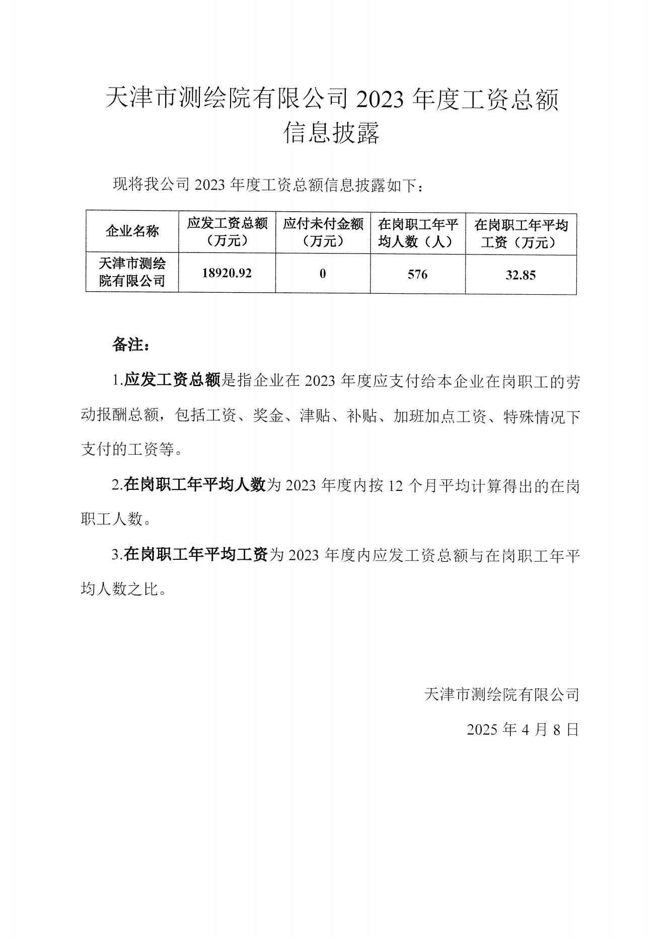 天津市測繪院有限公司2023年度工資總額信息披露